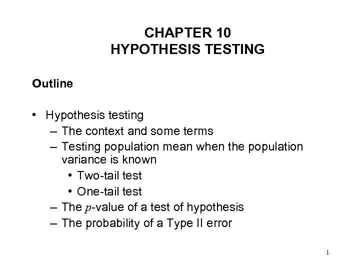 CHAPTER 10 HYPOTHESIS TESTING Outline • Hypothesis testing – The context and some terms – Testing population mean when the population variance is known • Two-tail test • One-tail test – The p-value of a test of hypothesis – The probability of a Type II error 1