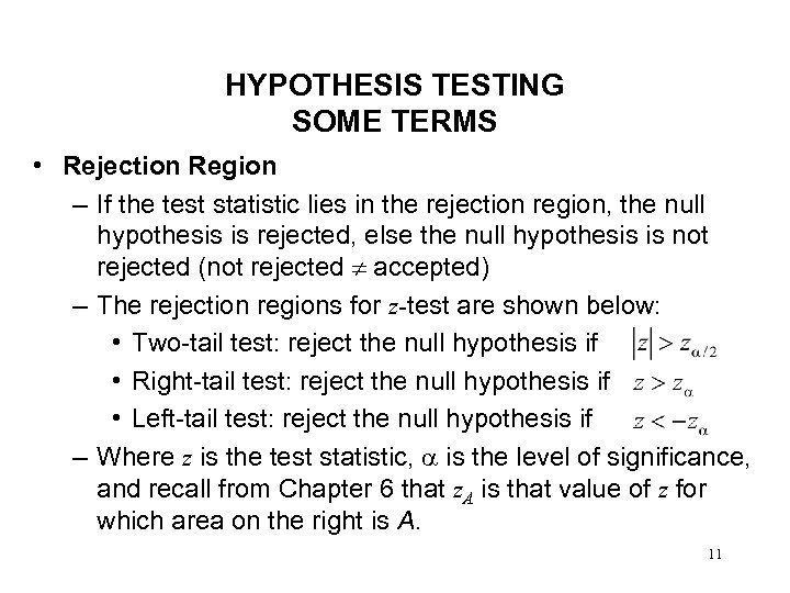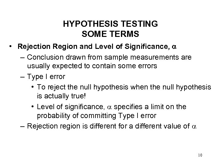 HYPOTHESIS TESTING SOME TERMS • Rejection Region and Level of Significance, – Conclusion drawn from sample measurements are usually expected to contain some errors – Type I error • To reject the null hypothesis when the null hypothesis is actually true! • Level of significance, specifies a limit on the probability of committing Type I error – Rejection region is different for a different value of 10