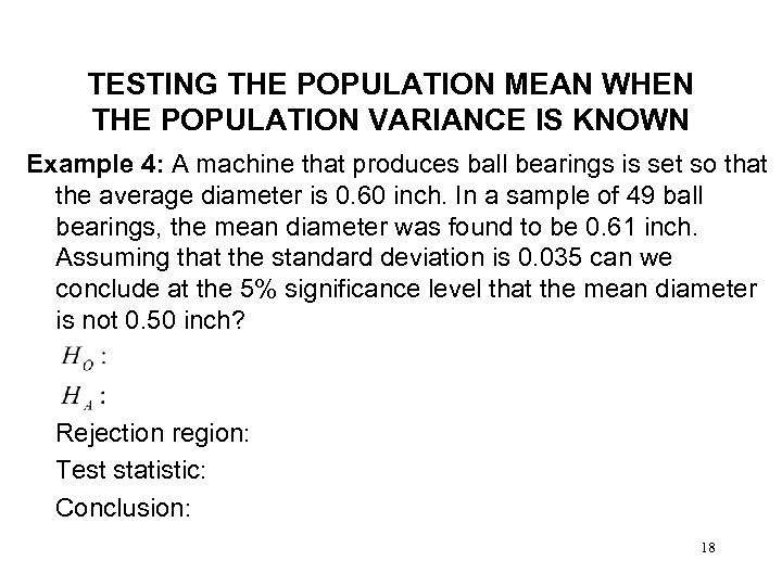 TESTING THE POPULATION MEAN WHEN THE POPULATION VARIANCE IS KNOWN Example 4: A machine that produces ball bearings is set so that the average diameter is 0. 60 inch. In a sample of 49 ball bearings, the mean diameter was found to be 0. 61 inch. Assuming that the standard deviation is 0. 035 can we conclude at the 5% significance level that the mean diameter is not 0. 50 inch? Rejection region: Test statistic: Conclusion: 18