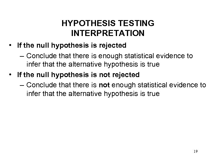 HYPOTHESIS TESTING INTERPRETATION • If the null hypothesis is rejected – Conclude that there is enough statistical evidence to infer that the alternative hypothesis is true • If the null hypothesis is not rejected – Conclude that there is not enough statistical evidence to infer that the alternative hypothesis is true 19