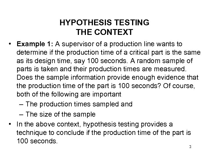 HYPOTHESIS TESTING THE CONTEXT • Example 1: A supervisor of a production line wants to determine if the production time of a critical part is the same as its design time, say 100 seconds. A random sample of parts is taken and their production times are measured. Does the sample information provide enough evidence that the production time of the part is 100 seconds? Of course, both of the following are important – The production times sampled and – The size of the sample • In the above context, hypothesis testing provides a technique to conclude if the production time of the part is 100 seconds. 2