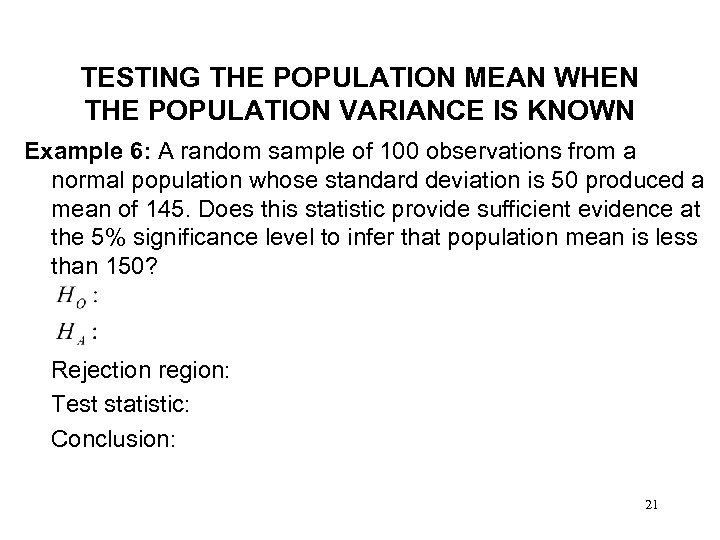 TESTING THE POPULATION MEAN WHEN THE POPULATION VARIANCE IS KNOWN Example 5: A random sample of 100 observations from a normal population whose standard deviation is 50 produced a mean of 145. Does this statistic provide sufficient evidence at the 5% significance level to infer that population mean is more than 140? Rejection region: Test statistic: Conclusion: 20