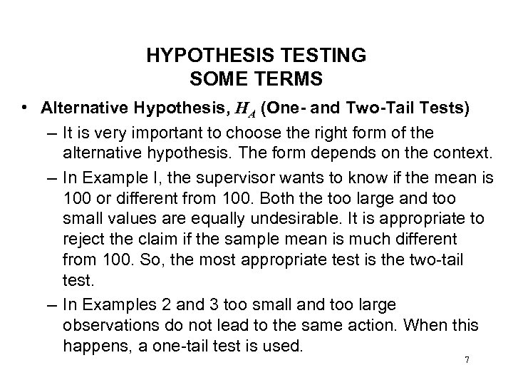 HYPOTHESIS TESTING SOME TERMS • Alternative Hypothesis, HA – The alternative hypothesis is very important because the conclusion of the hypothesis testing is stated in terms of alternative hypothesis – Hypothesis testing provides a technique to determine if there is enough statistical evidence that the alternative hypothesis is true. – There are three forms of alternative hypothesis: Two-tail test One-tail (right-tail) test One-tail (left-tail) test Example 1 Example 2 Example 3 6