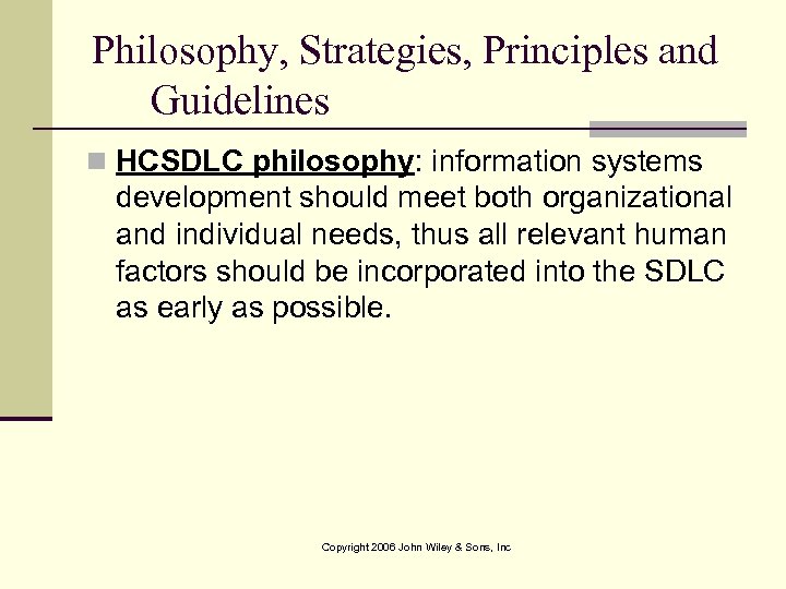 Philosophy, Strategies, Principles and Guidelines n HCSDLC philosophy: information systems development should meet both organizational and individual needs, thus all relevant human factors should be incorporated into the SDLC as early as possible. Copyright 2006 John Wiley & Sons, Inc