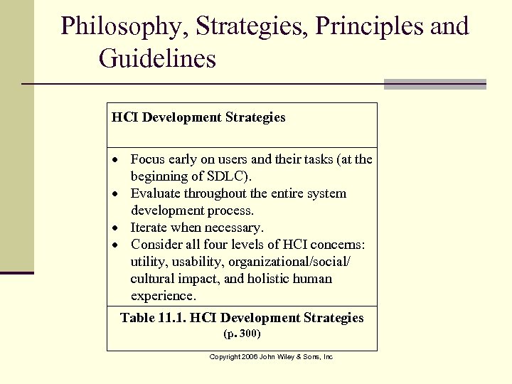 Philosophy, Strategies, Principles and Guidelines HCI Development Strategies Focus early on users and their tasks (at the beginning of SDLC). Evaluate throughout the entire system development process. Iterate when necessary. Consider all four levels of HCI concerns: utility, usability, organizational/social/ cultural impact, and holistic human experience. Table 11. 1. HCI Development Strategies (p. 300) Copyright 2006 John Wiley & Sons, Inc