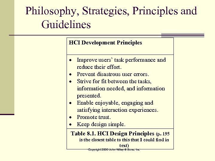 Philosophy, Strategies, Principles and Guidelines HCI Development Principles Improve users’ task performance and reduce their effort. Prevent disastrous user errors. Strive for fit between the tasks, information needed, and information presented. Enable enjoyable, engaging and satisfying interaction experiences. Promote trust. Keep design simple. Table 8. 1. HCI Design Principles (p. 195 is the closest table to this that I could find in text) Copyright 2006 John Wiley & Sons, Inc