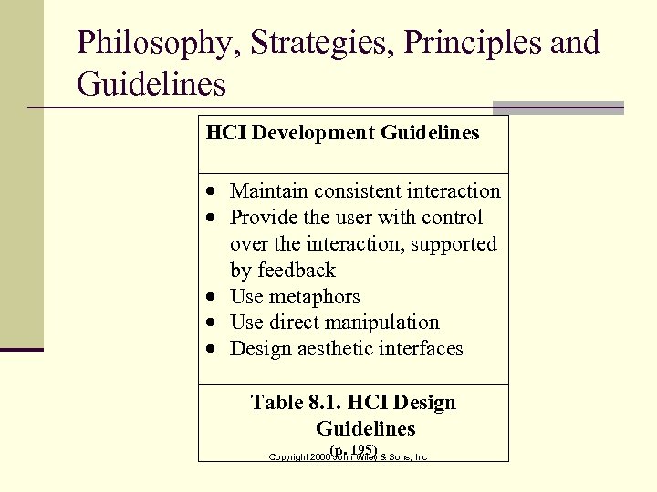 Philosophy, Strategies, Principles and Guidelines HCI Development Guidelines Maintain consistent interaction Provide the user with control over the interaction, supported by feedback Use metaphors Use direct manipulation Design aesthetic interfaces Table 8. 1. HCI Design Guidelines (p. 195) Copyright 2006 John Wiley & Sons, Inc