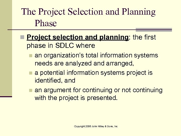 The Project Selection and Planning Phase n Project selection and planning: the first phase in SDLC where an organization’s total information systems needs are analyzed and arranged, n a potential information systems project is identified, and n an argument for continuing or not continuing with the project is presented. n Copyright 2006 John Wiley & Sons, Inc