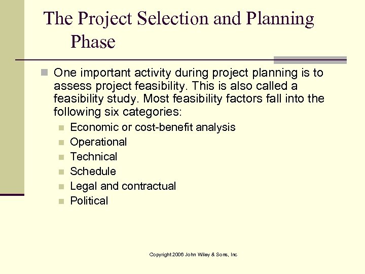 The Project Selection and Planning Phase n One important activity during project planning is to assess project feasibility. This is also called a feasibility study. Most feasibility factors fall into the following six categories: n n n Economic or cost-benefit analysis Operational Technical Schedule Legal and contractual Political Copyright 2006 John Wiley & Sons, Inc