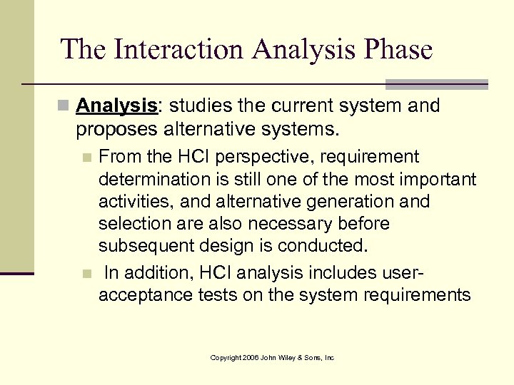 The Interaction Analysis Phase n Analysis: studies the current system and proposes alternative systems. From the HCI perspective, requirement determination is still one of the most important activities, and alternative generation and selection are also necessary before subsequent design is conducted. n In addition, HCI analysis includes useracceptance tests on the system requirements n Copyright 2006 John Wiley & Sons, Inc