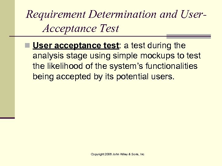 Requirement Determination and User. Acceptance Test n User acceptance test: a test during the analysis stage using simple mockups to test the likelihood of the system’s functionalities being accepted by its potential users. Copyright 2006 John Wiley & Sons, Inc