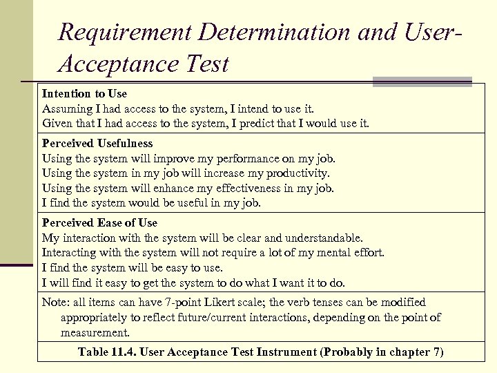 Requirement Determination and User. Acceptance Test Intention to Use Assuming I had access to the system, I intend to use it. Given that I had access to the system, I predict that I would use it. Perceived Usefulness Using the system will improve my performance on my job. Using the system in my job will increase my productivity. Using the system will enhance my effectiveness in my job. I find the system would be useful in my job. Perceived Ease of Use My interaction with the system will be clear and understandable. Interacting with the system will not require a lot of my mental effort. I find the system will be easy to use. I will find it easy to get the system to do what I want it to do. Note: all items can have 7 -point Likert scale; the verb tenses can be modified appropriately to reflect future/current interactions, depending on the point of measurement. Table 11. 4. User Acceptance Test Instrument (Probably in chapter 7)