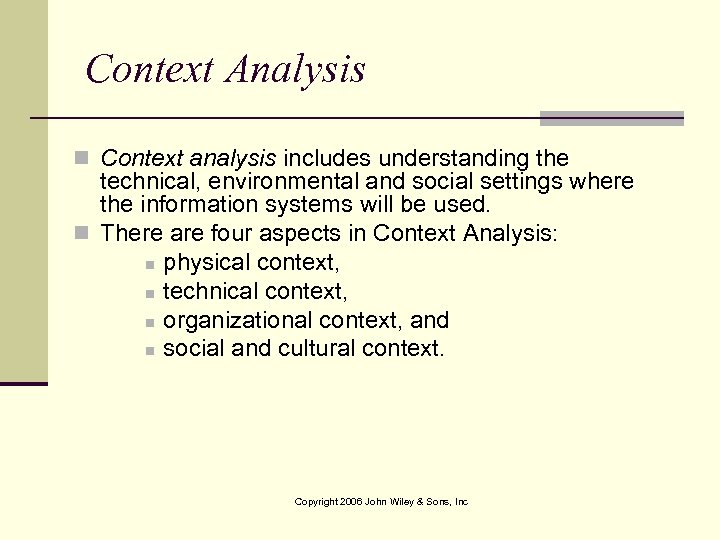 Context Analysis n Context analysis includes understanding the technical, environmental and social settings where the information systems will be used. n There are four aspects in Context Analysis: n physical context, n technical context, n organizational context, and n social and cultural context. Copyright 2006 John Wiley & Sons, Inc