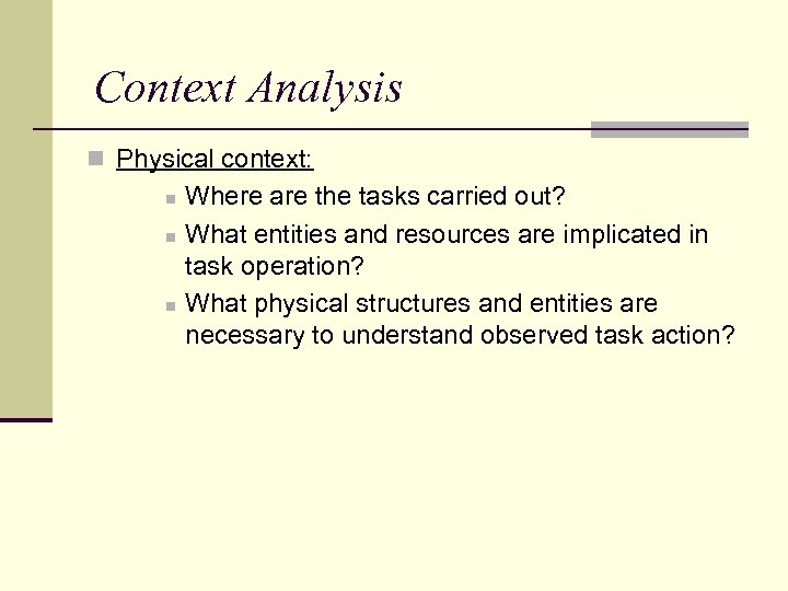 Context Analysis n Physical context: n n n Where are the tasks carried out? What entities and resources are implicated in task operation? What physical structures and entities are necessary to understand observed task action?