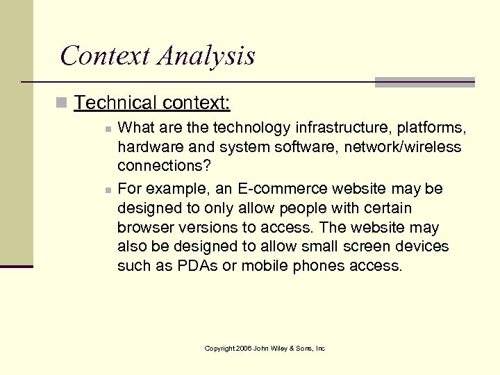 Context Analysis n Technical context: n n What are the technology infrastructure, platforms, hardware and system software, network/wireless connections? For example, an E-commerce website may be designed to only allow people with certain browser versions to access. The website may also be designed to allow small screen devices such as PDAs or mobile phones access. Copyright 2006 John Wiley & Sons, Inc