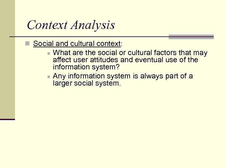 Context Analysis n Social and cultural context: n n What are the social or cultural factors that may affect user attitudes and eventual use of the information system? Any information system is always part of a larger social system.