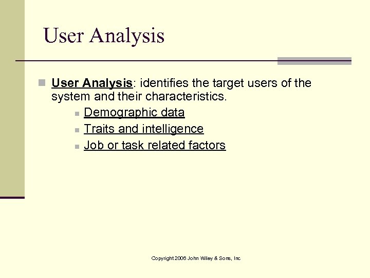 User Analysis n User Analysis: identifies the target users of the system and their characteristics. n Demographic data n Traits and intelligence n Job or task related factors Copyright 2006 John Wiley & Sons, Inc