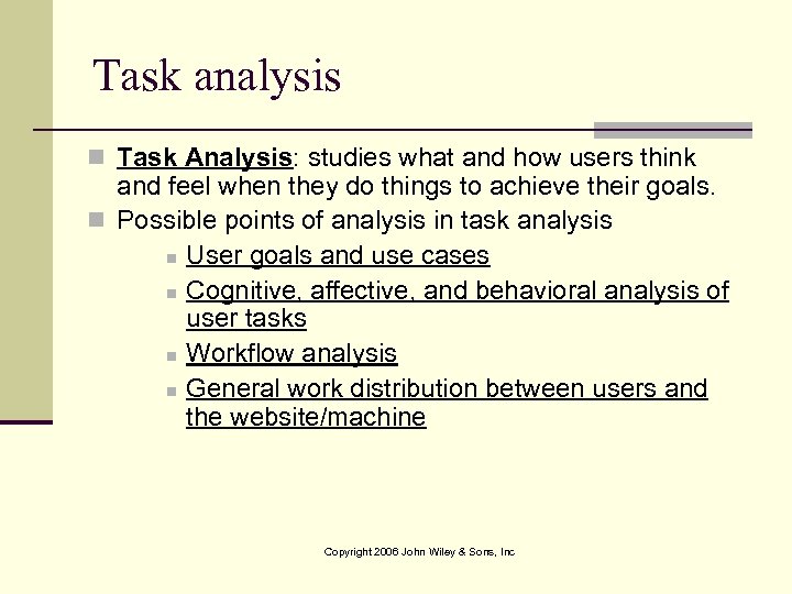Task analysis n Task Analysis: studies what and how users think and feel when they do things to achieve their goals. n Possible points of analysis in task analysis n User goals and use cases n Cognitive, affective, and behavioral analysis of user tasks n Workflow analysis n General work distribution between users and the website/machine Copyright 2006 John Wiley & Sons, Inc