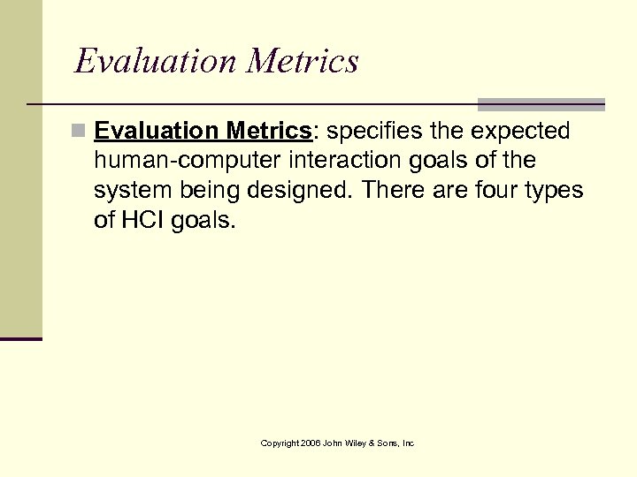 Evaluation Metrics n Evaluation Metrics: specifies the expected human-computer interaction goals of the system being designed. There are four types of HCI goals. Copyright 2006 John Wiley & Sons, Inc