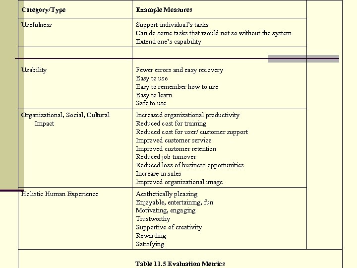 Category/Type Example Measures Usefulness Support individual’s tasks Can do some tasks that would not so without the system Extend one’s capability Usability Fewer errors and easy recovery Easy to use Easy to remember how to use Easy to learn Safe to use Organizational, Social, Cultural Impact Increased organizational productivity Reduced cost for training Reduced cost for user/ customer support Improved customer service Improved customer retention Reduced job turnover Reduced loss of business opportunities Increase in sales Improved organizational image Holistic Human Experience Aesthetically pleasing Enjoyable, entertaining, fun Motivating, engaging Trustworthy Supportive of creativity Rewarding Satisfying Table 11. 5 Evaluation Metrics