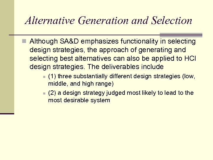 Alternative Generation and Selection n Although SA&D emphasizes functionality in selecting design strategies, the approach of generating and selecting best alternatives can also be applied to HCI design strategies. The deliverables include n n (1) three substantially different design strategies (low, middle, and high range) (2) a design strategy judged most likely to lead to the most desirable system