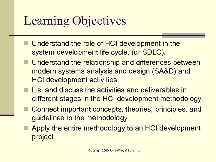 Learning Objectives n Understand the role of HCI development in the n n system development life cycle, (or SDLC). Understand the relationship and differences between modern systems analysis and design (SA&D) and HCI development activities. List and discuss the activities and deliverables in different stages in the HCI development methodology. Connect important concepts, theories, principles, and guidelines to the methodology Apply the entire methodology to an HCI development project. Copyright 2006 John Wiley & Sons, Inc