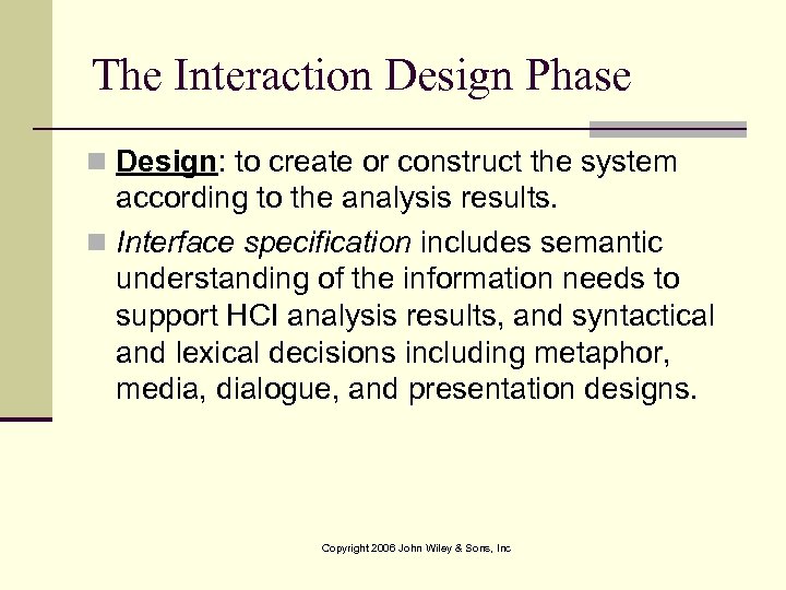 The Interaction Design Phase n Design: to create or construct the system according to the analysis results. n Interface specification includes semantic understanding of the information needs to support HCI analysis results, and syntactical and lexical decisions including metaphor, media, dialogue, and presentation designs. Copyright 2006 John Wiley & Sons, Inc