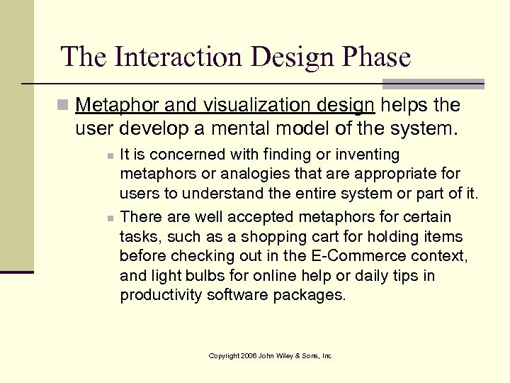 The Interaction Design Phase n Metaphor and visualization design helps the user develop a mental model of the system. n n It is concerned with finding or inventing metaphors or analogies that are appropriate for users to understand the entire system or part of it. There are well accepted metaphors for certain tasks, such as a shopping cart for holding items before checking out in the E-Commerce context, and light bulbs for online help or daily tips in productivity software packages. Copyright 2006 John Wiley & Sons, Inc