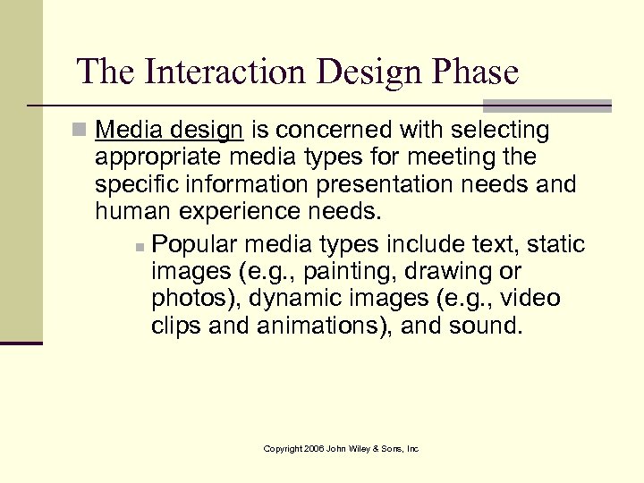 The Interaction Design Phase n Media design is concerned with selecting appropriate media types for meeting the specific information presentation needs and human experience needs. n Popular media types include text, static images (e. g. , painting, drawing or photos), dynamic images (e. g. , video clips and animations), and sound. Copyright 2006 John Wiley & Sons, Inc