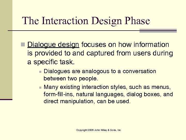 The Interaction Design Phase n Dialogue design focuses on how information is provided to and captured from users during a specific task. n n Dialogues are analogous to a conversation between two people. Many existing interaction styles, such as menus, form-fill-ins, natural languages, dialog boxes, and direct manipulation, can be used. Copyright 2006 John Wiley & Sons, Inc