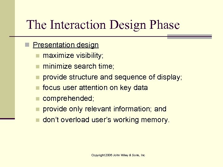The Interaction Design Phase n Presentation design n n n maximize visibility; minimize search time; provide structure and sequence of display; focus user attention on key data comprehended; provide only relevant information; and don’t overload user’s working memory. Copyright 2006 John Wiley & Sons, Inc