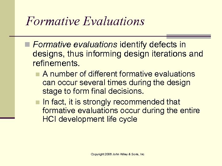 Formative Evaluations n Formative evaluations identify defects in designs, thus informing design iterations and refinements. A number of different formative evaluations can occur several times during the design stage to form final decisions. n In fact, it is strongly recommended that formative evaluations occur during the entire HCI development life cycle n Copyright 2006 John Wiley & Sons, Inc