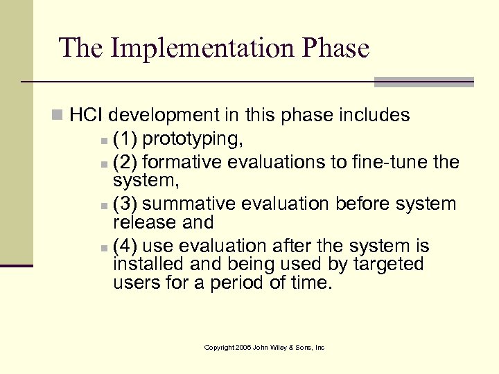 The Implementation Phase n HCI development in this phase includes (1) prototyping, n (2) formative evaluations to fine-tune the system, n (3) summative evaluation before system release and n (4) use evaluation after the system is installed and being used by targeted users for a period of time. n Copyright 2006 John Wiley & Sons, Inc
