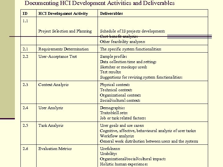 Documenting HCI Development Activities and Deliverables ID HCI Development Activity Deliverables Project Selection and Planning Schedule of IS projects development: Cost-benefit analysis: Other feasibility analyses: 2. 1 Requirements Determination The specific system functionalities: 2. 2 User-Acceptance Test Sample profile: Data collection time and setting: Sketches or mockups used: Test results: Suggestions for revising system functionalities: 2. 3 Context Analysis Physical context: Technical context: Organizational context: Social/cultural context: 2. 4 User Analysis Demographic: Traits/skill sets: Job or task related factors: 2. 5 Task Analysis User goals and use cases: Cognitive, affective, behavioural analysis of user tasks: Workflow analysis: General work distribution between users and the system: 2. 6 Evaluation Metrics Usefulness: Usability: Organizational/social/cultural impact: Holistic human experience: 1. 1