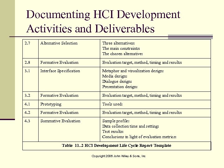 Documenting HCI Development Activities and Deliverables 2. 7 Alternative Selection Three alternatives: The main constraints: The chosen alternative: 2. 8 Formative Evaluation target, method, timing and results: 3. 1 Interface Specification Metaphor and visualization design: Media design: Dialogue design: Presentation design: 3. 2 Formative Evaluation target, method, timing and results: 4. 1 Prototyping Tools used: 4. 2 Formative Evaluation target, method, timing and results: 4. 3 Summative Evaluation Sample profile: Data collection time and setting: Test results: Conclusions in light of evaluation metrics: Table 11. . 2 HCI Development Life Cycle Report Template Copyright 2006 John Wiley & Sons, Inc
