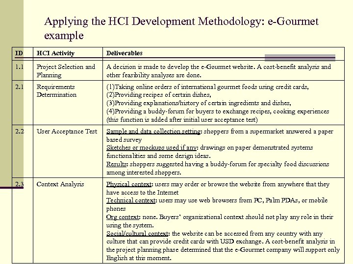 Applying the HCI Development Methodology: e-Gourmet example ID HCI Activity Deliverables 1. 1 Project Selection and Planning A decision is made to develop the e-Gourmet website. A cost-benefit analysis and other feasibility analyses are done. 2. 1 Requirements Determination (1)Taking online orders of international gourmet foods using credit cards, (2)Providing recipes of certain dishes, (3)Providing explanations/history of certain ingredients and dishes, (4)Providing a buddy-forum for buyers to exchange recipes, cooking experiences (this function is added after initial user acceptance test) 2. 2 User Acceptance Test Sample and data collection setting: shoppers from a supermarket answered a paper based survey Sketches or mockups used if any: drawings on paper demonstrated systems functionalities and some design ideas. Results: shoppers suggested having a buddy-forum for specialty food discussions among interested shoppers. 2. 3 Context Analysis Physical context: users may order or browse the website from anywhere that they have access to the Internet Technical context: users may use web browsers from PC, Palm PDAs, or mobile phones Org context: none. Buyers’ organizational context should not play any role in their using the system. Social/cultural context: the website can be accessed from any country with any culture that can provide credit cards with USD exchange. A cost-benefit analysis in the project planning phase determined that the e-Gourmet company will support only English at this moment.