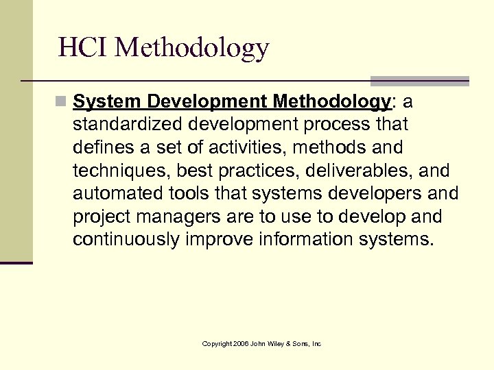 HCI Methodology n System Development Methodology: a standardized development process that defines a set of activities, methods and techniques, best practices, deliverables, and automated tools that systems developers and project managers are to use to develop and continuously improve information systems. Copyright 2006 John Wiley & Sons, Inc