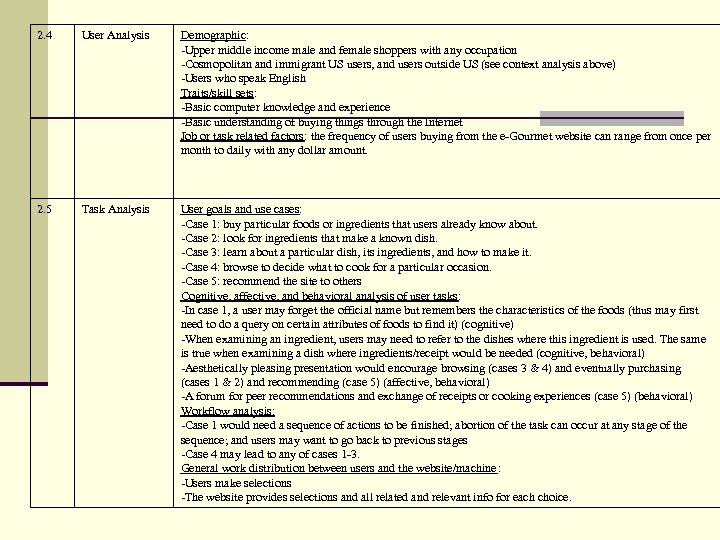 2. 4 User Analysis Demographic: -Upper middle income male and female shoppers with any occupation -Cosmopolitan and immigrant US users, and users outside US (see context analysis above) -Users who speak English Traits/skill sets: -Basic computer knowledge and experience -Basic understanding of buying things through the Internet Job or task related factors: the frequency of users buying from the e-Gourmet website can range from once per month to daily with any dollar amount. 2. 5 Task Analysis User goals and use cases: -Case 1: buy particular foods or ingredients that users already know about. -Case 2: look for ingredients that make a known dish. -Case 3: learn about a particular dish, its ingredients, and how to make it. -Case 4: browse to decide what to cook for a particular occasion. -Case 5: recommend the site to others Cognitive, affective, and behavioral analysis of user tasks: -In case 1, a user may forget the official name but remembers the characteristics of the foods (thus may first need to do a query on certain attributes of foods to find it) (cognitive) -When examining an ingredient, users may need to refer to the dishes where this ingredient is used. The same is true when examining a dish where ingredients/receipt would be needed (cognitive, behavioral) -Aesthetically pleasing presentation would encourage browsing (cases 3 & 4) and eventually purchasing (cases 1 & 2) and recommending (case 5) (affective, behavioral) -A forum for peer recommendations and exchange of receipts or cooking experiences (case 5) (behavioral) Workflow analysis: -Case 1 would need a sequence of actions to be finished; abortion of the task can occur at any stage of the sequence; and users may want to go back to previous stages -Case 4 may lead to any of cases 1 -3. General work distribution between users and the website/machine: -Users make selections -The website provides selections and all related and relevant info for each choice.
