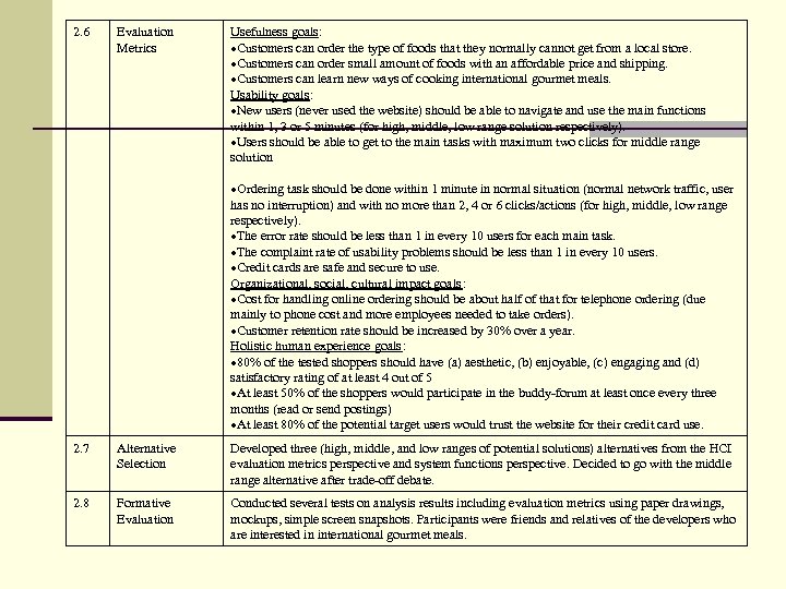 2. 6 Evaluation Metrics Usefulness goals: Customers can order the type of foods that they normally cannot get from a local store. Customers can order small amount of foods with an affordable price and shipping. Customers can learn new ways of cooking international gourmet meals. Usability goals: New users (never used the website) should be able to navigate and use the main functions within 1, 3 or 5 minutes (for high, middle, low range solution respectively). Users should be able to get to the main tasks with maximum two clicks for middle range solution Ordering task should be done within 1 minute in normal situation (normal network traffic, user has no interruption) and with no more than 2, 4 or 6 clicks/actions (for high, middle, low range respectively). The error rate should be less than 1 in every 10 users for each main task. The complaint rate of usability problems should be less than 1 in every 10 users. Credit cards are safe and secure to use. Organizational, social, cultural impact goals: Cost for handling online ordering should be about half of that for telephone ordering (due mainly to phone cost and more employees needed to take orders). Customer retention rate should be increased by 30% over a year. Holistic human experience goals: 80% of the tested shoppers should have (a) aesthetic, (b) enjoyable, (c) engaging and (d) satisfactory rating of at least 4 out of 5 At least 50% of the shoppers would participate in the buddy-forum at least once every three months (read or send postings) At least 80% of the potential target users would trust the website for their credit card use. 2. 7 Alternative Selection Developed three (high, middle, and low ranges of potential solutions) alternatives from the HCI evaluation metrics perspective and system functions perspective. Decided to go with the middle range alternative after trade-off debate. 2. 8 Formative Evaluation Conducted several tests on analysis results including evaluation metrics using paper drawings, mockups, simple screen snapshots. Participants were friends and relatives of the developers who are interested in international gourmet meals.