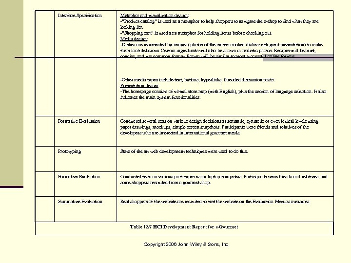 Interface Specification Metaphor and visualization design: -“Product catalog” is used as a metaphor to help shoppers to navigate the e-shop to find what they are looking for. -“Shopping cart” is used as a metaphor for holding items before checking out. Media design: -Dishes are represented by images (photos of the master cooked dishes with great presentation) to make them look delicious. Certain ingredients will also be shown in realistic photos. Recipes will be brief, concise, and use common format. Forum will be similar to most successful online forums. -Other media types include text, buttons, hyperlinks, threaded discussion posts. Presentation design: -The homepage consists of virtual store map (with English), plus the section of language selection. It also indicates the main system functionalities. Formative Evaluation Conducted several tests on various design decisions at semantic, syntactic or even lexical levels using paper drawings, mockups, simple screen snapshots. Participants were friends and relatives of the developers who are interested in international gourmet meals. Prototyping State of the art web development techniques were used to do this. Formative Evaluation Conducted tests on various prototypes using laptop computers. Participants were friends and relatives, and some shoppers recruited from a gourmet shop. Summative Evaluation Real shoppers of the website are recruited to test the website on the Evaluation Metrics measures. Table 12. 7 HCI Development Report for e-Gourmet Copyright 2006 John Wiley & Sons, Inc