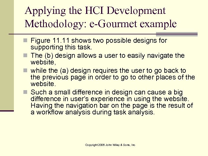 Applying the HCI Development Methodology: e-Gourmet example n Figure 11. 11 shows two possible designs for supporting this task. n The (b) design allows a user to easily navigate the website, n while the (a) design requires the user to go back to the previous page in order to go to other places of the website. n Such a small difference in design cause a big difference in user’s experience in using the website. Having the navigation bar on the page is the result of a workflow analysis during task analysis. Copyright 2006 John Wiley & Sons, Inc
