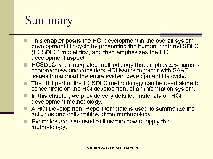 Summary n This chapter posits the HCI development in the overall system n n n development life cycle by presenting the human-centered SDLC (HCSDLC) model first, and then emphasizes the HCI development aspect. HCSDLC is an integrated methodology that emphasizes humancenteredness and considers HCI issues together with SA&D issues throughout the entire system development life cycle. The HCI part of the HCSDLC methodology can be used alone to concentrate on the HCI development of an information system. In this chapter, we provide very detailed materials on HCI development methodology. A HCI Development Report template is used to summarize the activities and deliverables of the methodology. Examples are also used to illustrate how to apply the methodology. Copyright 2006 John Wiley & Sons, Inc