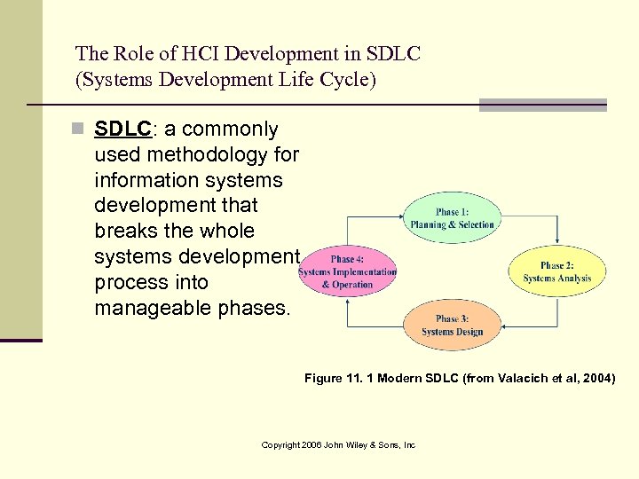 The Role of HCI Development in SDLC (Systems Development Life Cycle) n SDLC: a commonly used methodology for information systems development that breaks the whole systems development process into manageable phases. Figure 11. 1 Modern SDLC (from Valacich et al, 2004) Copyright 2006 John Wiley & Sons, Inc