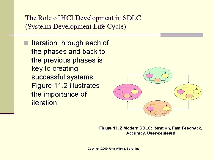 The Role of HCI Development in SDLC (Systems Development Life Cycle) n Iteration through each of the phases and back to the previous phases is key to creating successful systems. Figure 11. 2 illustrates the importance of iteration. Figure 11. 2 Modern SDLC: Iteration, Fast Feedback, Accuracy, User-centered Copyright 2006 John Wiley & Sons, Inc