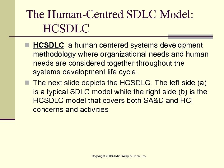 The Human-Centred SDLC Model: HCSDLC n HCSDLC: a human centered systems development methodology where organizational needs and human needs are considered together throughout the systems development life cycle. n The next slide depicts the HCSDLC. The left side (a) is a typical SDLC model while the right side (b) is the HCSDLC model that covers both SA&D and HCI concerns and activities Copyright 2006 John Wiley & Sons, Inc