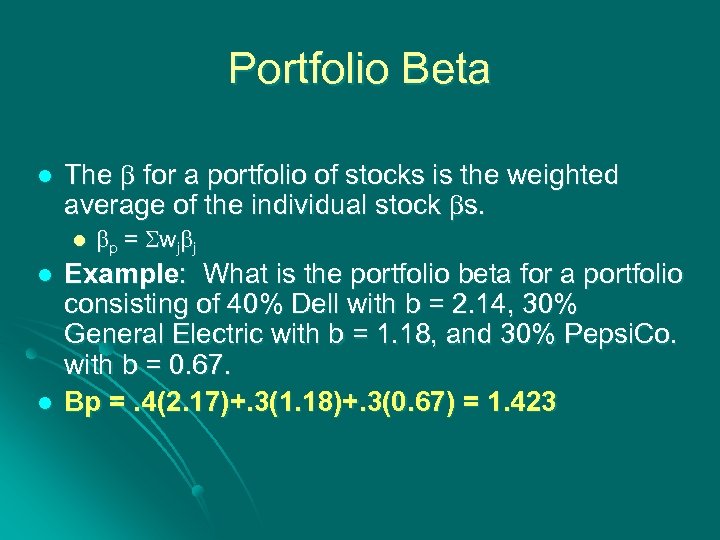Portfolio Beta l The b for a portfolio of stocks is the weighted average of the individual stock bs. l l l b p = S w jb j Example: What is the portfolio beta for a portfolio consisting of 40% Dell with b = 2. 14, 30% General Electric with b = 1. 18, and 30% Pepsi. Co. with b = 0. 67. Bp =. 4(2. 17)+. 3(1. 18)+. 3(0. 67) = 1. 423