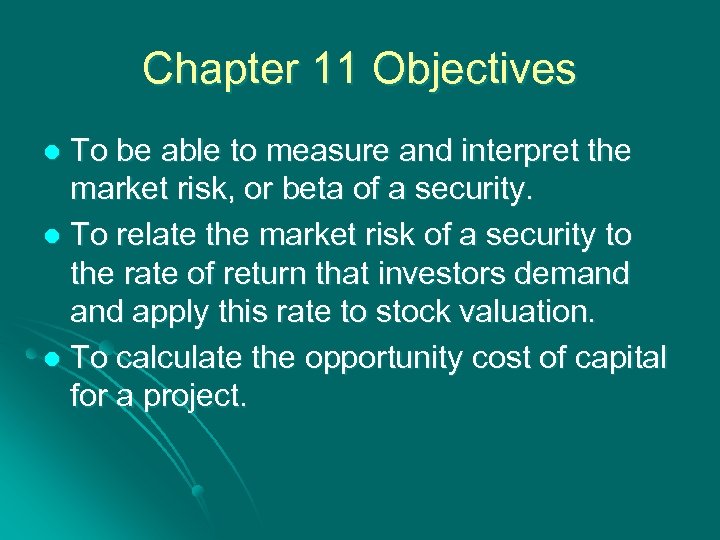 Chapter 11 Objectives To be able to measure and interpret the market risk, or beta of a security. l To relate the market risk of a security to the rate of return that investors demand apply this rate to stock valuation. l To calculate the opportunity cost of capital for a project. l