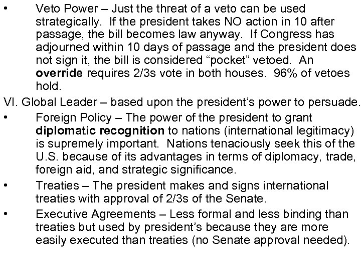 • Veto Power – Just the threat of a veto can be used strategically. If the president takes NO action in 10 after passage, the bill becomes law anyway. If Congress has adjourned within 10 days of passage and the president does not sign it, the bill is considered “pocket” vetoed. An override requires 2/3 s vote in both houses. 96% of vetoes hold. VI. Global Leader – based upon the president’s power to persuade. • Foreign Policy – The power of the president to grant diplomatic recognition to nations (international legitimacy) is supremely important. Nations tenaciously seek this of the U. S. because of its advantages in terms of diplomacy, trade, foreign aid, and strategic significance. • Treaties – The president makes and signs international treaties with approval of 2/3 s of the Senate. • Executive Agreements – Less formal and less binding than treaties but used by president’s because they are more easily executed than treaties (no Senate approval needed).