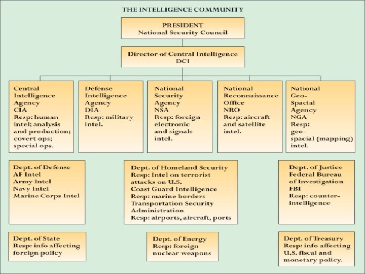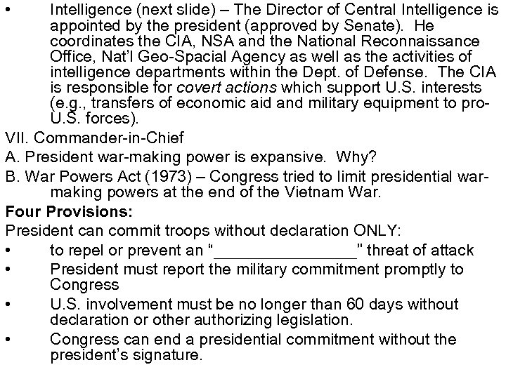 • Intelligence (next slide) – The Director of Central Intelligence is appointed by the president (approved by Senate). He coordinates the CIA, NSA and the National Reconnaissance Office, Nat’l Geo-Spacial Agency as well as the activities of intelligence departments within the Dept. of Defense. The CIA is responsible for covert actions which support U. S. interests (e. g. , transfers of economic aid and military equipment to pro. U. S. forces). VII. Commander-in-Chief A. President war-making power is expansive. Why? B. War Powers Act (1973) – Congress tried to limit presidential warmaking powers at the end of the Vietnam War. Four Provisions: President can commit troops without declaration ONLY: • to repel or prevent an “________” threat of attack • President must report the military commitment promptly to Congress • U. S. involvement must be no longer than 60 days without declaration or other authorizing legislation. • Congress can end a presidential commitment without the president’s signature.
