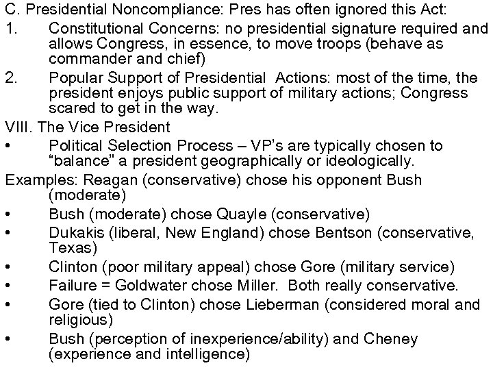 C. Presidential Noncompliance: Pres has often ignored this Act: 1. Constitutional Concerns: no presidential signature required and allows Congress, in essence, to move troops (behave as commander and chief) 2. Popular Support of Presidential Actions: most of the time, the president enjoys public support of military actions; Congress scared to get in the way. VIII. The Vice President • Political Selection Process – VP’s are typically chosen to “balance” a president geographically or ideologically. Examples: Reagan (conservative) chose his opponent Bush (moderate) • Bush (moderate) chose Quayle (conservative) • Dukakis (liberal, New England) chose Bentson (conservative, Texas) • Clinton (poor military appeal) chose Gore (military service) • Failure = Goldwater chose Miller. Both really conservative. • Gore (tied to Clinton) chose Lieberman (considered moral and religious) • Bush (perception of inexperience/ability) and Cheney (experience and intelligence)